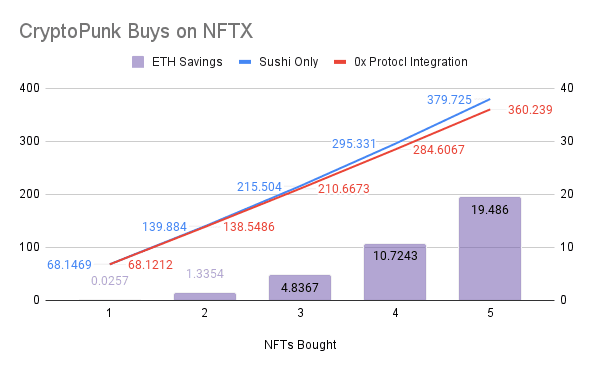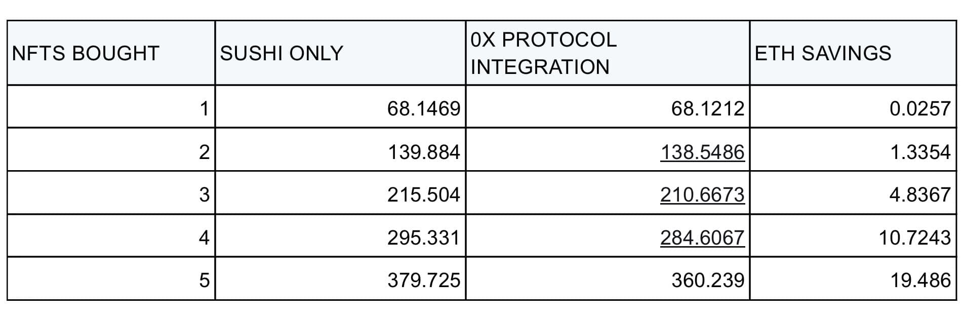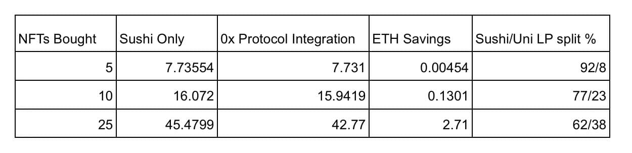 Integrating the 0x protocol allows NFTX to continue distributing fees to users staking their Sushi positions. It also ensures users can get tighter spreads and reduce slippage when buying NFTs from vaults backed with concentrated liquidity positions.