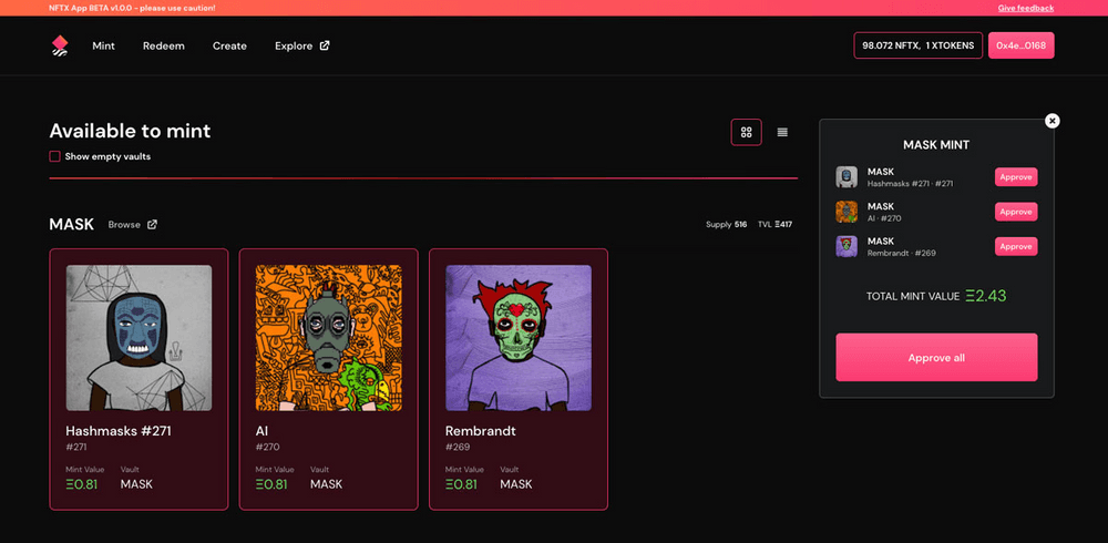 - Automatically view the NFTs you have available to mint based on the current set of NFTX vaults.
