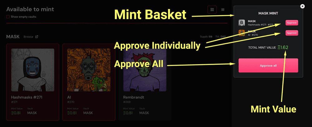 When selecting NFTs you will see a mint basket appear for the vault. This basket shows you an overview of what you’ll be minting to the vault and the ETH value that your returned xTokens will be worth.