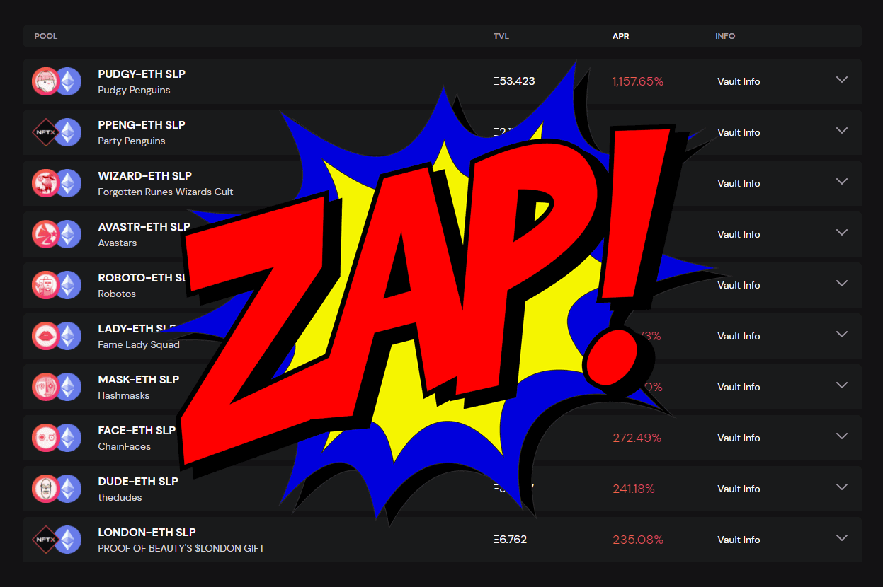 When NFTX V2 officially launched we introduced a Zap contract that allowed users to “Mint & Stake” as a way to escape the mint fee (typically 5%). The purpose of this was to remove the fee for users wishing to earn protocol fees by staking vault liquidity tokens.